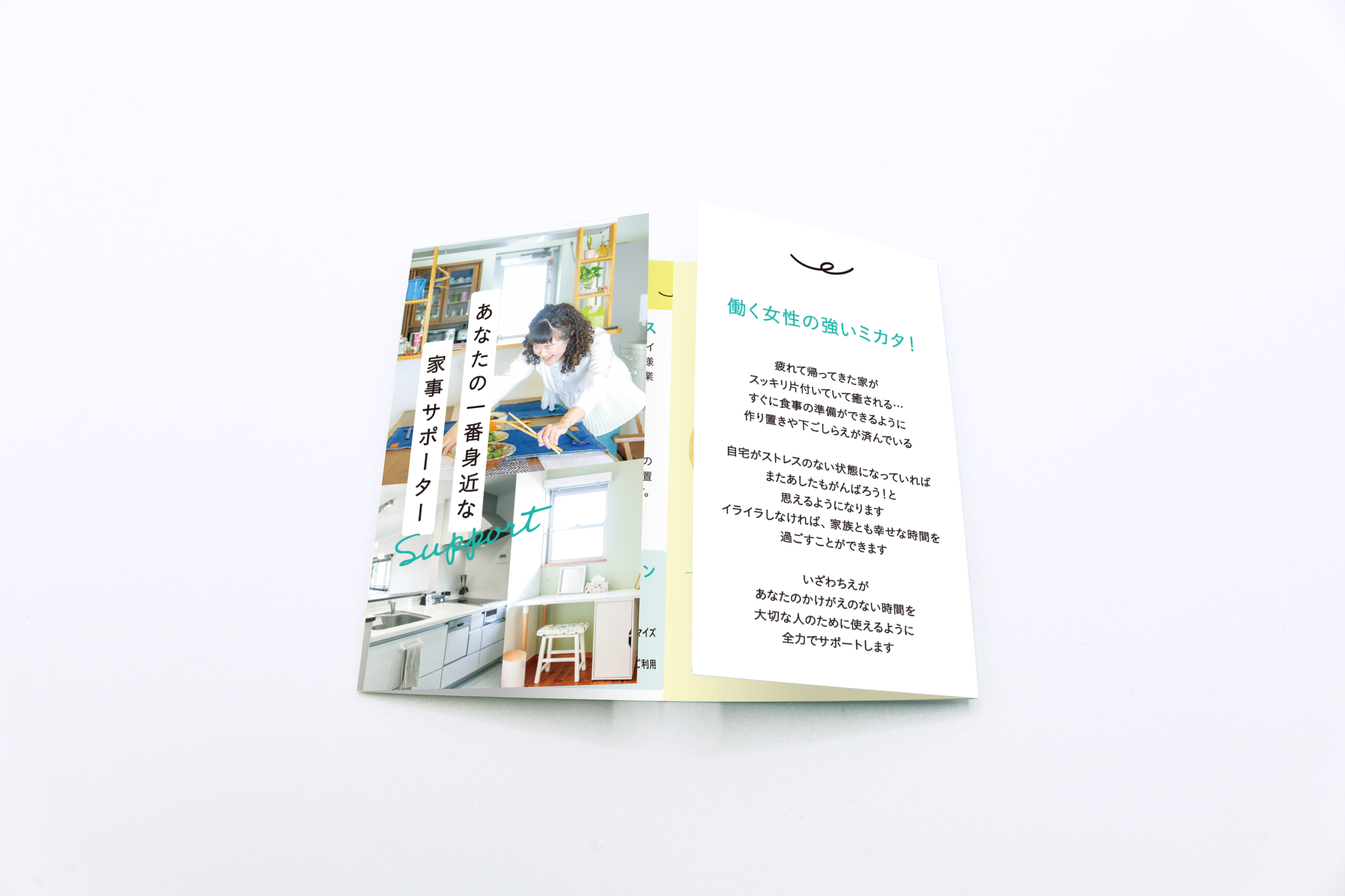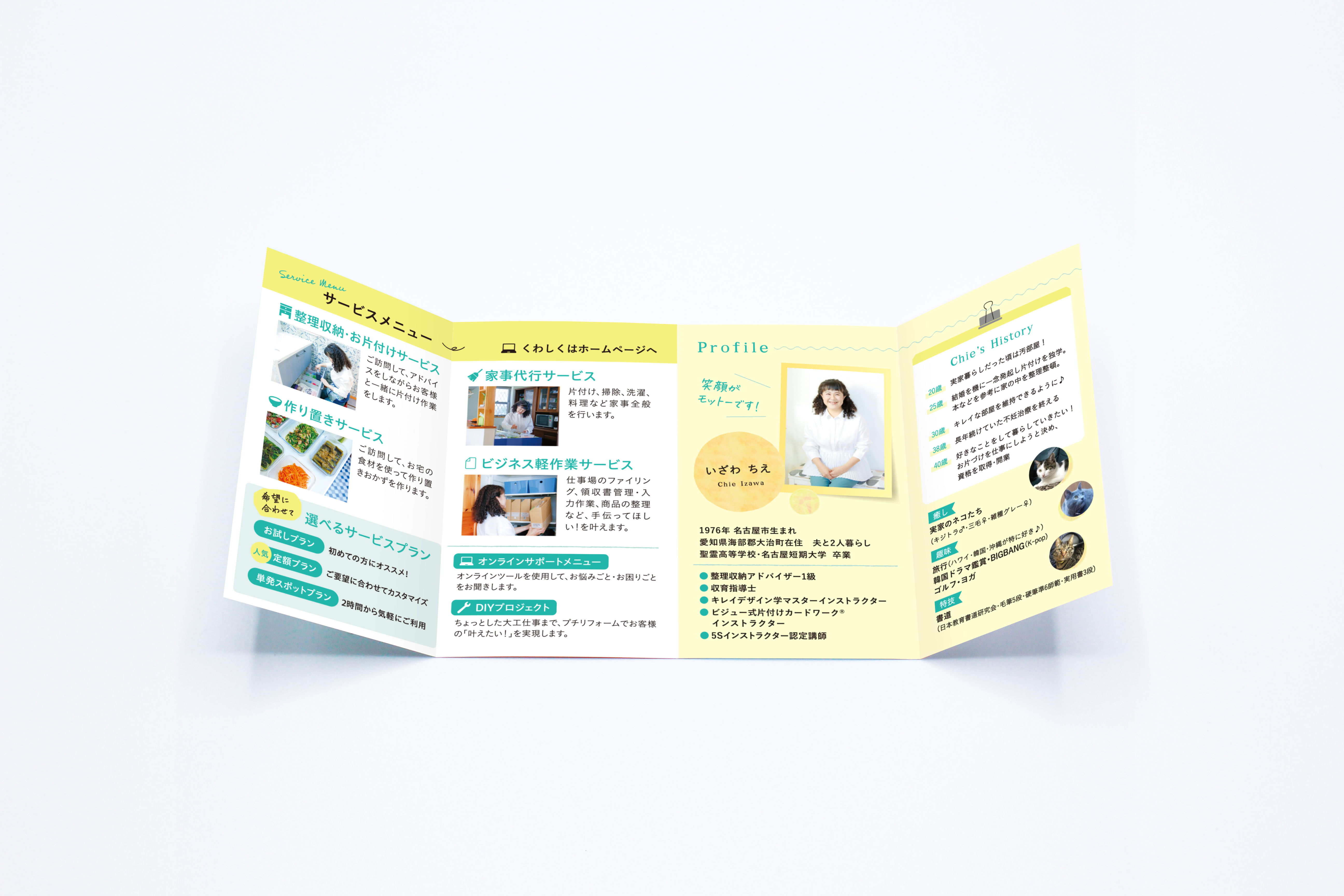 愛知県で整理収納のサービスを提供されているTidy House様の名刺をデザインをさせていただきました。 観音折りでリーフレット型の名刺になっています。 名刺サイズですが広げると8面になっており、通常の名刺では入らない情報も記載できます。