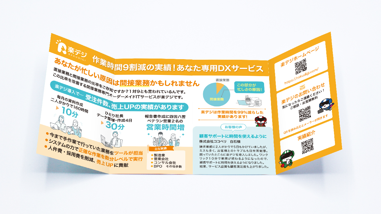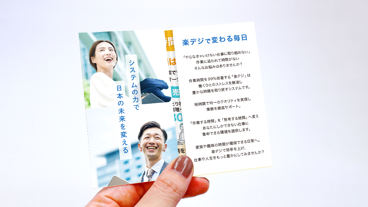一般的な名刺サイズながら、サービス内容や事例紹介をわかりやすく掲載して、交流会などの限られた時間でも「どんなサービスなのか」が一目で伝わるように構成しました。
