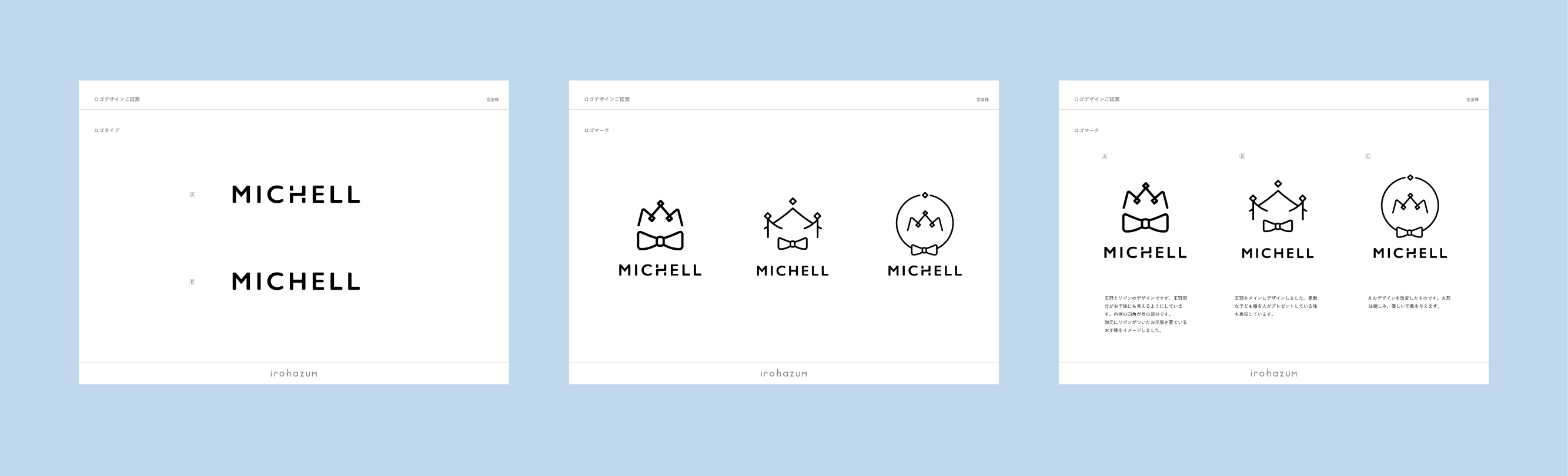 さらにヨーロッパを連想させる王冠を取り入れ、お子様が服を身につけた時に「お姫様や王子様になれた」と感じられるような特別感を込めました。MICHELL様の商品で多く見られたリボンの要素も加え、王冠と組み合わせることで「ちょっと背伸びした可愛らしさ」を表現しています。